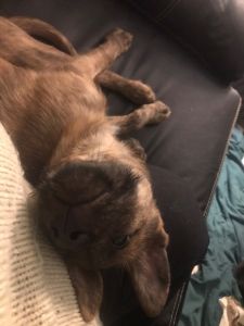 She is crate-trained, and is working diligently on house training. She is very, very smart and has caught on quickly to our routine. She also has caught on very well to what things are and are not hers for chewing. Overall she is definitely a delightful little girl and we are eager to find her an adopter who is willing to continue training her despite her disability. She gets along great with both dogs and cats but would also be fine as an only dog as she is very independent.