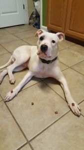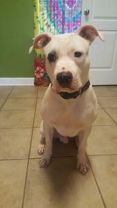 From his foster: We am currently fostering a 10 month old bully mix named Murphy. We took him in at 3 weeks old when he was separated from his mother. The person that had him was feeding him people food to keep him alive. Within a few months we realized that he was deaf and any interest he had in a forever home, quickly faded. Murphy spent about 12 days in a board and train program to learn several hand signals and commands to make him more adoptable. He has no aggression but is very energetic. Due to him being deaf he can not hear the cries of children or small dogs when he is hurting them trying to play. He doesn’t pick up on ques from other dogs that he is playing to rough. He is fixed and up to date on all of his shots. He is crate trained and somewhat house broke. He sometimes has accidents when he is excited and will cause mischief if he is bored. Overall he just wants love and attention and to play and fetch. He has an arsenal of hand signals including sit, stay, lay, go to place, leave it, come and roll over. He has a small amount of training with a vibration collar to get his attention.