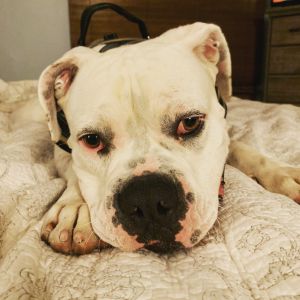 Meet adoptable deaf 2 year old American Bulldog Deebo who is looking for a loving forever home with someone who will cherish him and always keep him safe. Deebo is house trained, crate trained, has general sign training, is good with kids and other dogs.