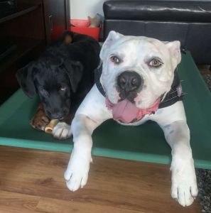 From his current caregiver: Deebo is a 2 year old American Bulldog mix. He is fully trained with hand signals and he walks perfectly on a leash. He weighs around 85 pounds. He loves to go for walks and he does great at the dog park and he enjoys snuggling while he snores in your ear.