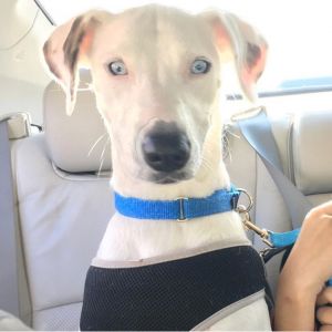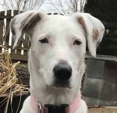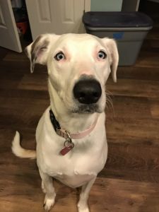 From her current caregivers: We adopted Marley from the shelter back in January. She’s a deaf Catahoula. White with Merle markings on her ears and some brown patches on her hind area. She is truly a beautiful dog. She loves our family and all they people she meets and she is perfectly house trained. Marley likes to play fetch but also thinks she’s a tiny lap dog. She’s not at all barky and she sleeps quietly all night. She knows some sign cues like “sit” “come” “paw” and “stay” although she needs work on an extended stay.